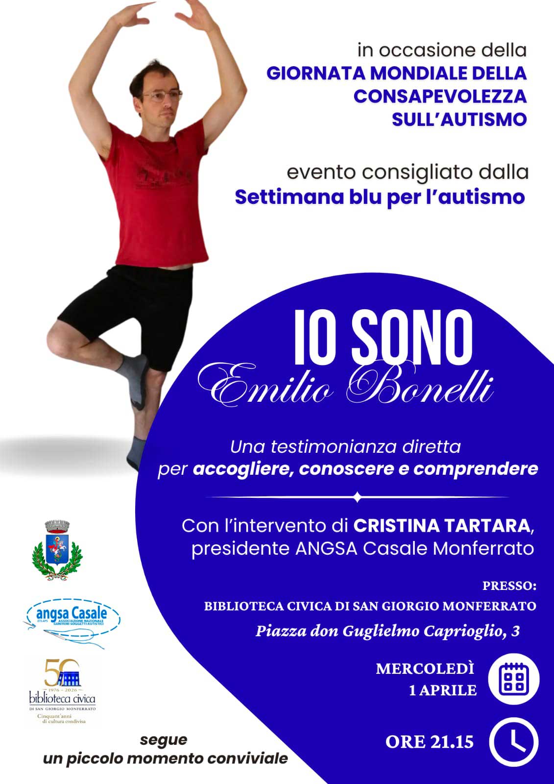 In occasione della “GIORNATA MONDIALE DELLA CONSAPEVOLEZZA SULL’AUTISMO” il 1° Aprile alle ore 21.15 presso la Biblioteca Civica di San Giorgio Monferrato, si svolgerà l’evento “Io sono Emilio Bonelli” una testimonianza diretta per accogliere , conoscere, comprendere.