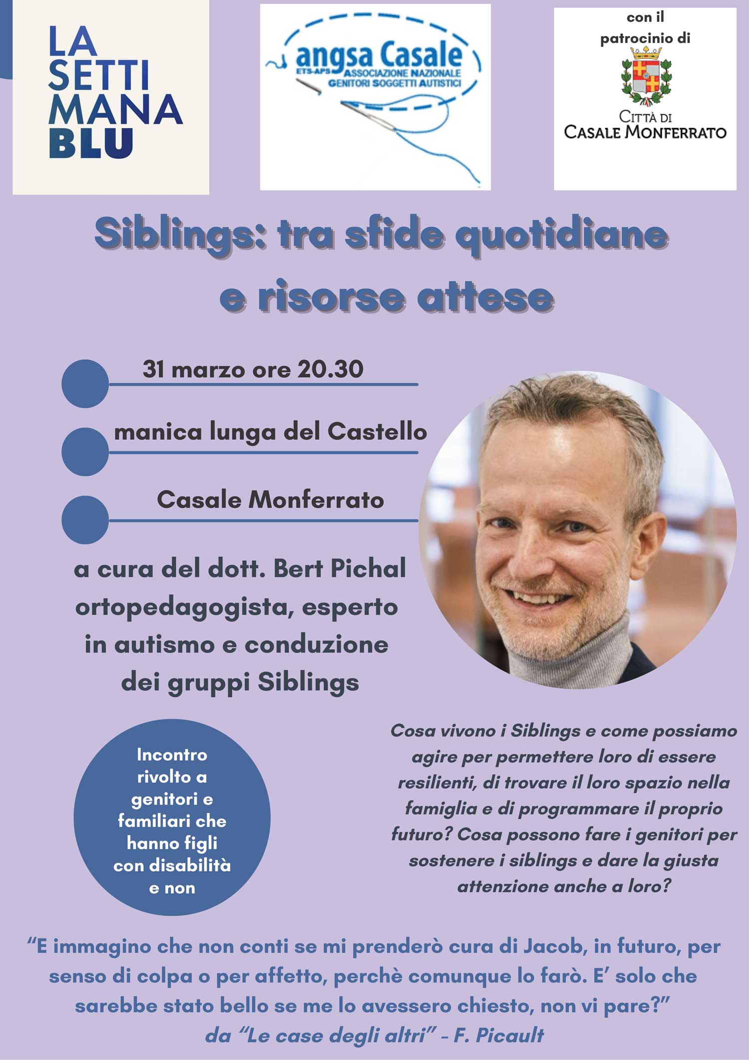 All’interno della “Settimana Blu” si svolgerà il 31 marzo alle ore 20.30 l’incontro “Siblings: tra sfide quotidiane e risorte attese “a cura del dott. Bert Pichal ortopedagogista, esperto in autismo e conduzione dei gruppi Siblings