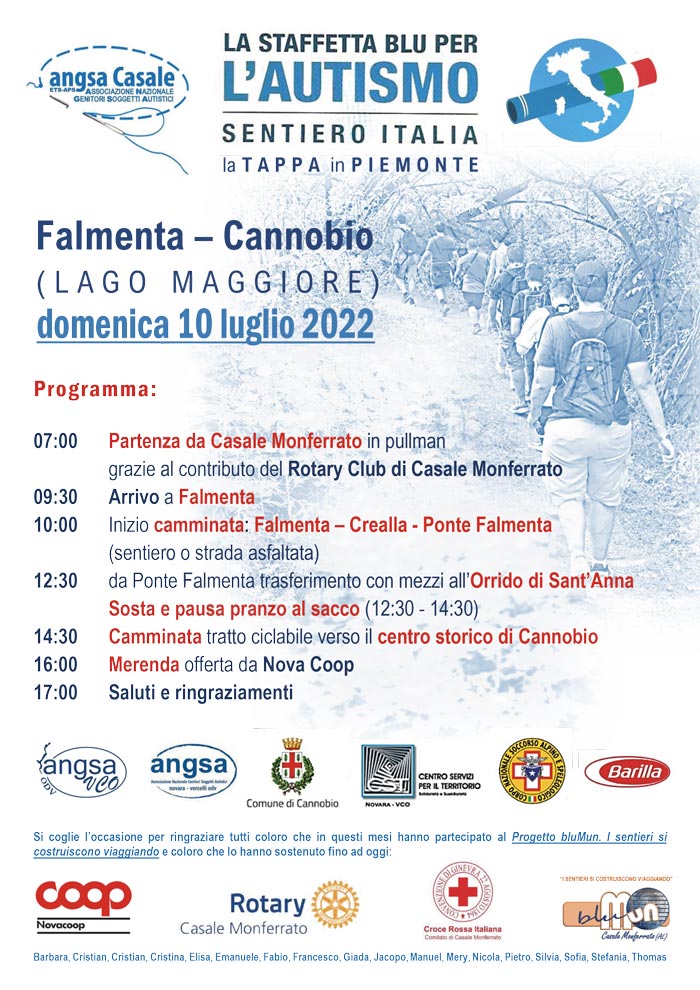 Nel corso di questi primi tre mesi sono state calendarizzate dieci camminate, con cadenza settimanale che hanno permesso di esplorare e conoscere Casale e di apprezzarne le bellezze. Le mete sono state: il Bosco della Pastrona, la Cittadella, la prima collina e il lungo Po. Qui sono state organizzate due Camminate ecologiche che hanno previsto la Pulizia dell’argine: un’azione di pubblica utilità che ha aggiunto ulteriore significato alle due giornate. La seconda camminata ecologica si è arricchita ulteriormente grazie alla partecipazione degli Operatori Polivalenti di Salvataggio in Acqua (OPSA) della CRI Comitato di Casale Monferrato che hanno accompagnato i ragazzi alla scoperta del mondo fluviale, con una breve lezione sull’ambiente alluvionale sulle sponde del grande fiume. Grazie alla presenza del nucleo Telecomunicazioni (TLC) del Comitato, sono state simulate delle conversazioni radio su canale protetto, esperienza per comprendere a fondo che le radio sono strumenti fondamentali in emergenza, in quanto unico strumento in grado di garantire le comunicazioni anche nelle situazioni più difficili. La camminata del 2 luglio è stata particolarmente impegnativa: Casale – Coniolo – CasaleLe attività anche semi-strutturate o guidate di conversazione/collaborazione fra i partecipanti, sono proseguite anche in alcune serate– al termine della camminata – in pizzeria e al cinemaL’esperienza si è conclusa il 10 luglio sul Lago Maggiore con la partecipazione al Progetto Nazionale denominato Staffetta Blu (partita dalla Sardegna il 23/04) a cui hanno aderito assocazioni di tutta Italia. II passaggio del testimone dalla Lombardia al Piemonte è avvenuto a Falmenta (VB) dove si è percorso un impegnativo tratto del Sentiero Italia.Le camminate bluMun riprenderanno dopo la pausa estiva, a partire da settembre, ANGSA Casale ringrazia Silvia Ottone, tutti coloro che hanno partecipato alle camminate e chi ha sostenuto il Progetto, in particolare: i volontari della CRI che ci hanno sempre accompagnati, Nova Coop per le magliette, zaini e cappellini bluMun realizzati da Fair Enough (Torino) e il Rotary Club di Casale Monferrato di Casale Monferrato che ha voluto favorire l’iniziativa sostenendo le spese del pullman che ci condotti a Falmenta (VB), punto di partenza della tappa piemontese della Staffetta Blu.